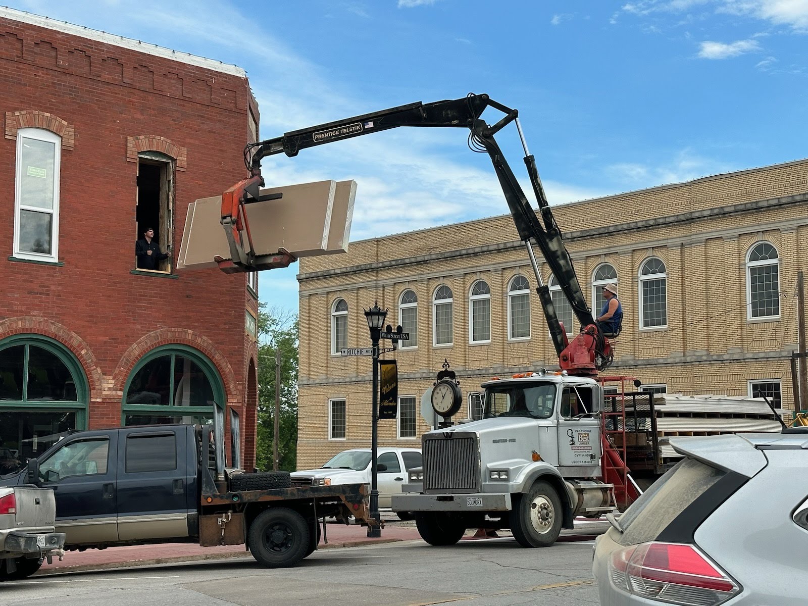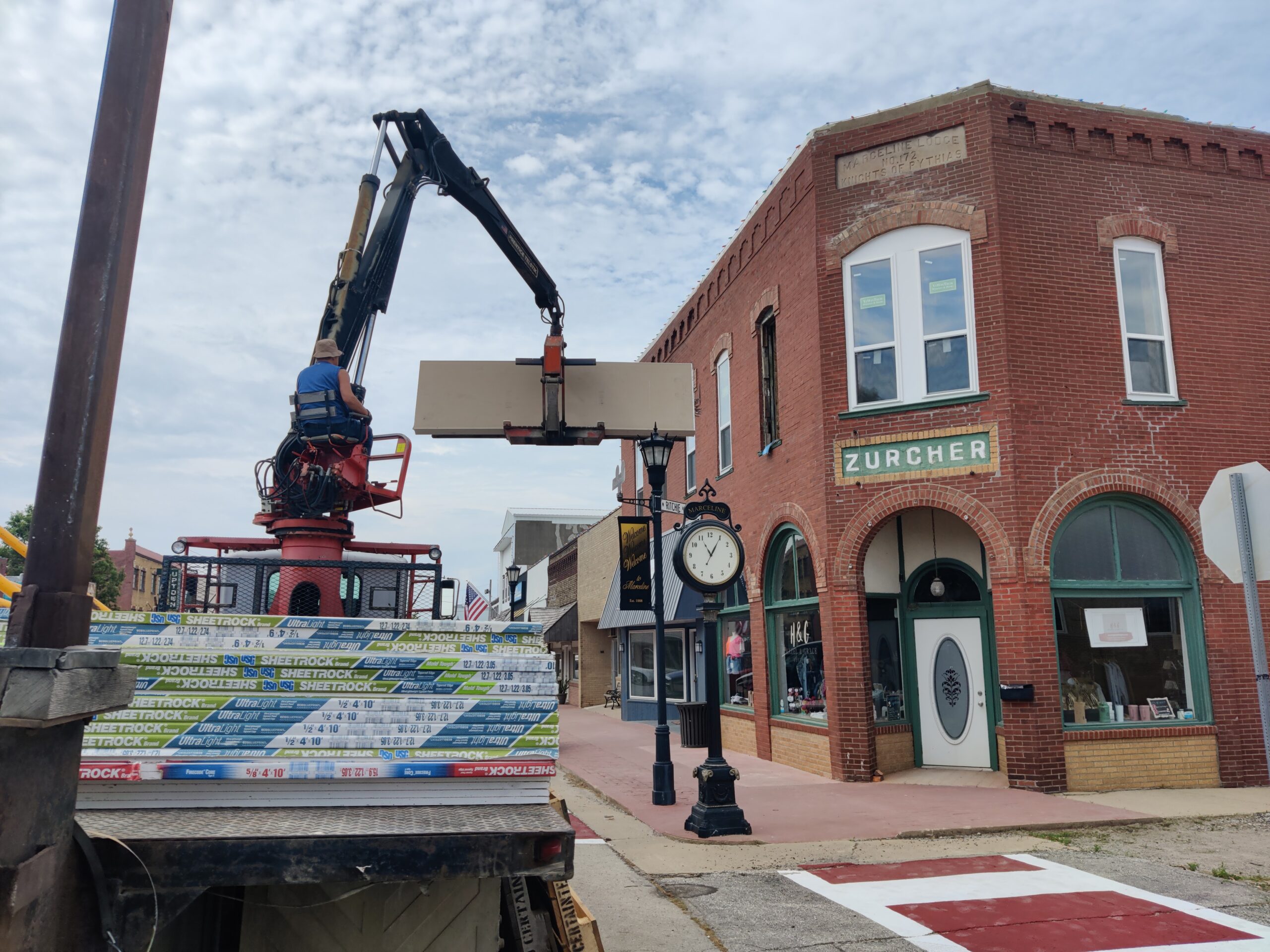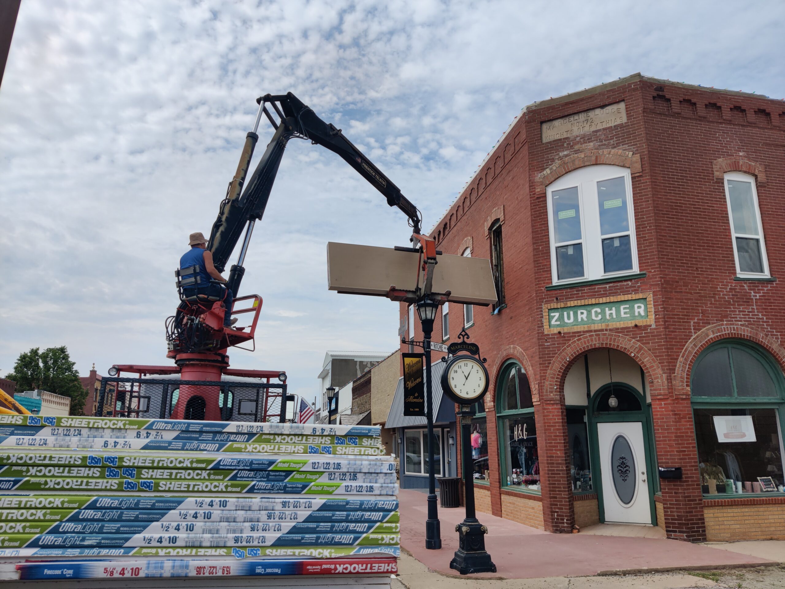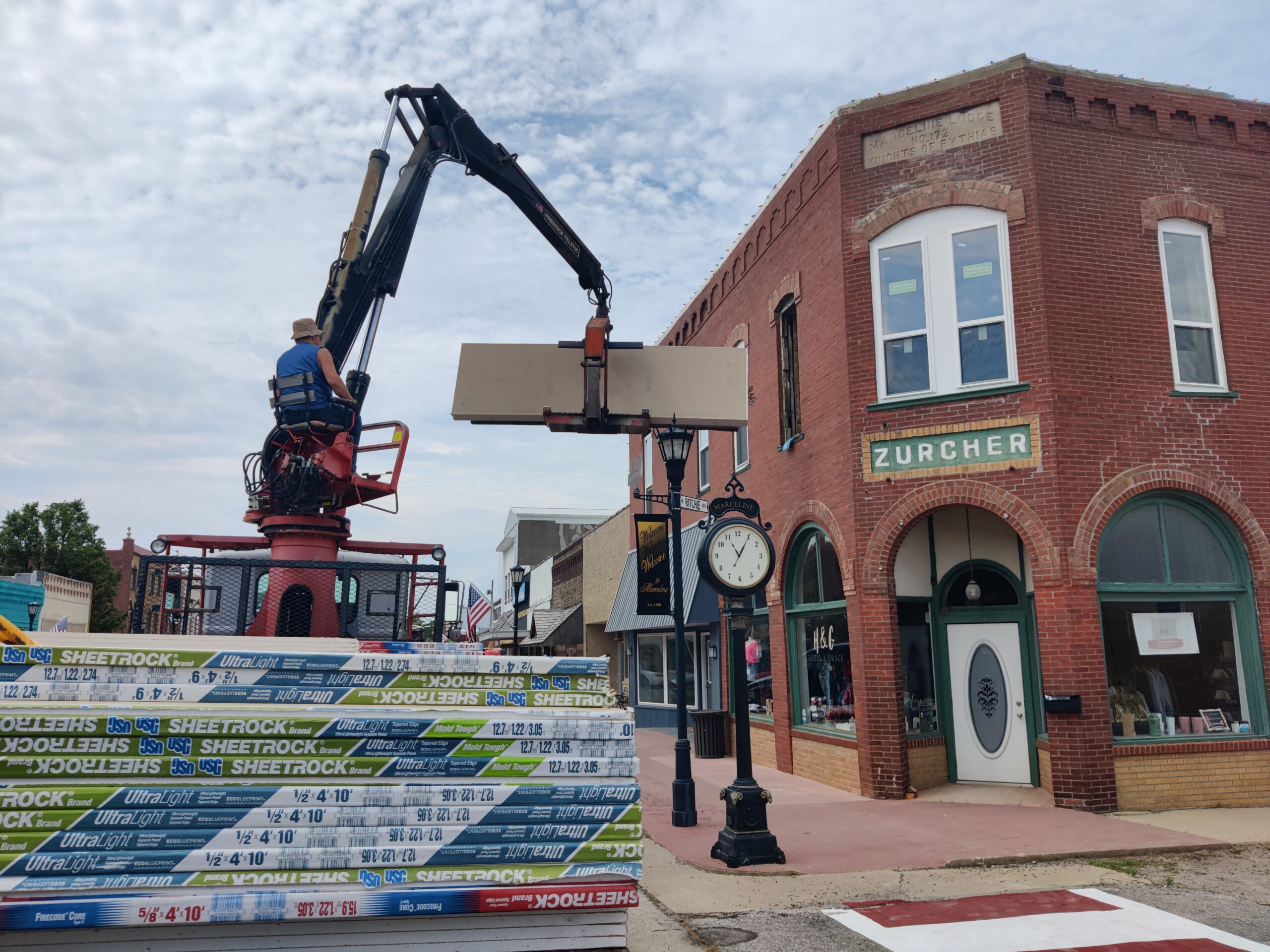 The 2nd floor of the Zurcher Building got a massive update in 2023. These pictures are of drywall being delivered through one of the window openings. The window had been removed so the boom could live the drywall through the opening without damage.