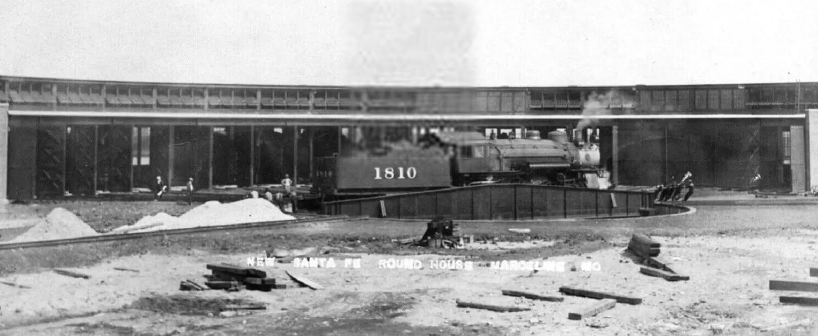 Photo of the roundhouse and turntable in the Santa Fe railway yard. Text on image says "New Santa Fe Round House - Marceline, MO"