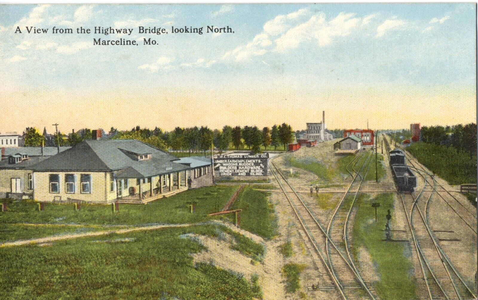 Color or colorized postcard from the perspective of the railroad bridge. Text on the postcard is: "A View from the Highway Bridge, looking North, Marceline, Mo."
