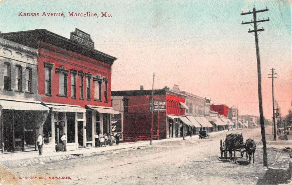 Printed on the card is "Kansas Avenue, Marceline, Mo." and "E. C. Kropp Co., Milwaukee"