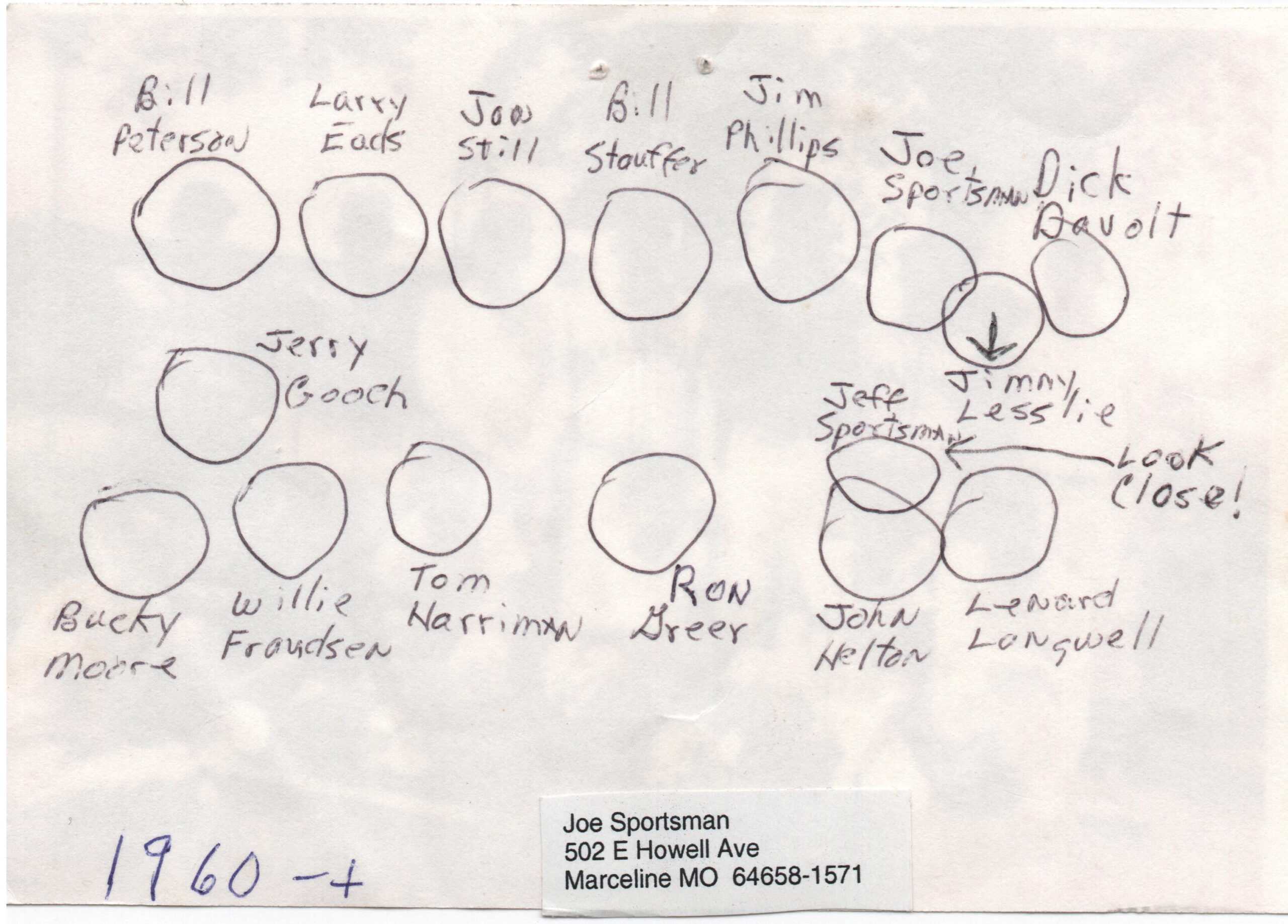 Kneeling, L-R: Lenard Longswell, Jeff Sportsman (child, mostly hidden behind John, right in front of Joe), John Helton, Ron Greer, Tom Harriman, Willie Frandsen, Jerry Gooch, Bucky Moore