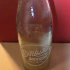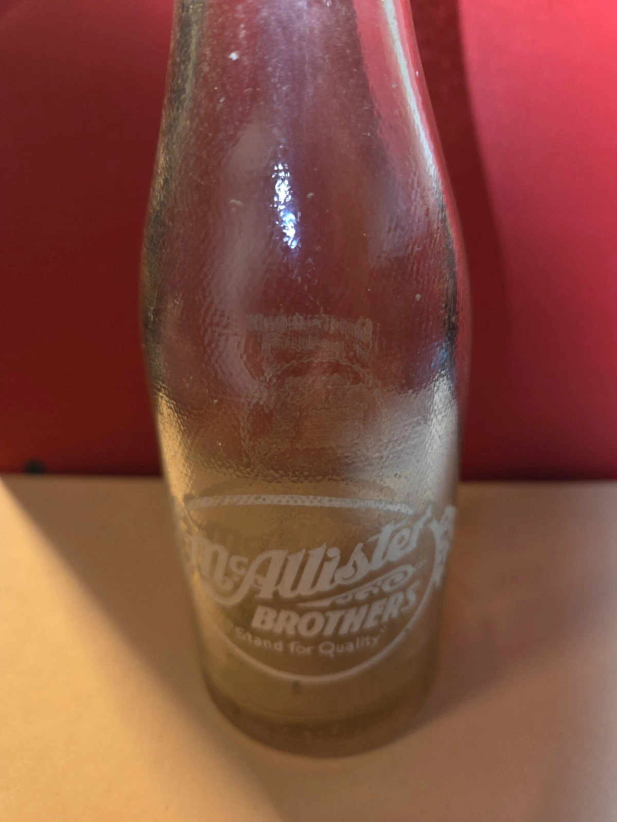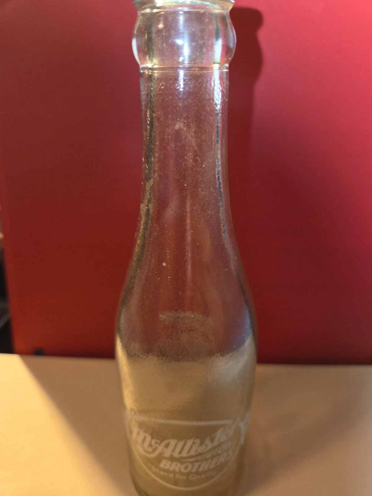 The ACL (Applied Colored Label) is white on glass, and is from the McAllister Brothers Bottling Works.