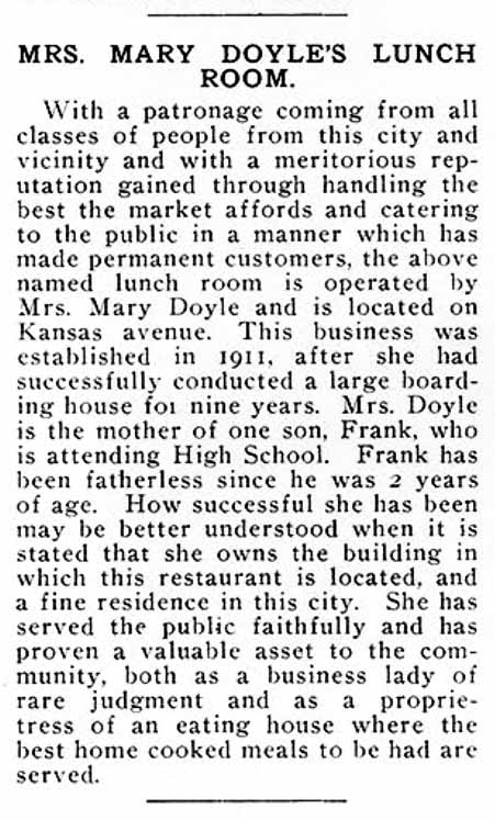 With a patronage coming from all classes of people from this city and vicinity and with a meritorious reputation gained through handling the best the market affords and catering to the public in a manner which has made permanent customers, the above named lunch room is operated by Mrs. Mary Doyle and is located on Kansas avenue. This business was established in 1911, after she had successfully conducted a large boarding house for nine years. Mrs. Doyle is the mother of one son, Frank, who is attending High School. Frank has been fatherless since he was 2 years of age. How successful she has been may be better understood when it is stated that she owns the building in which this restaurant is located, and a fine residence in this city. She has served the public faithfully and has proven a valuable asset to the community, both as a business lady of rare judgment and as a proprietress of an eating house where the best home cooked meals to be had are served.