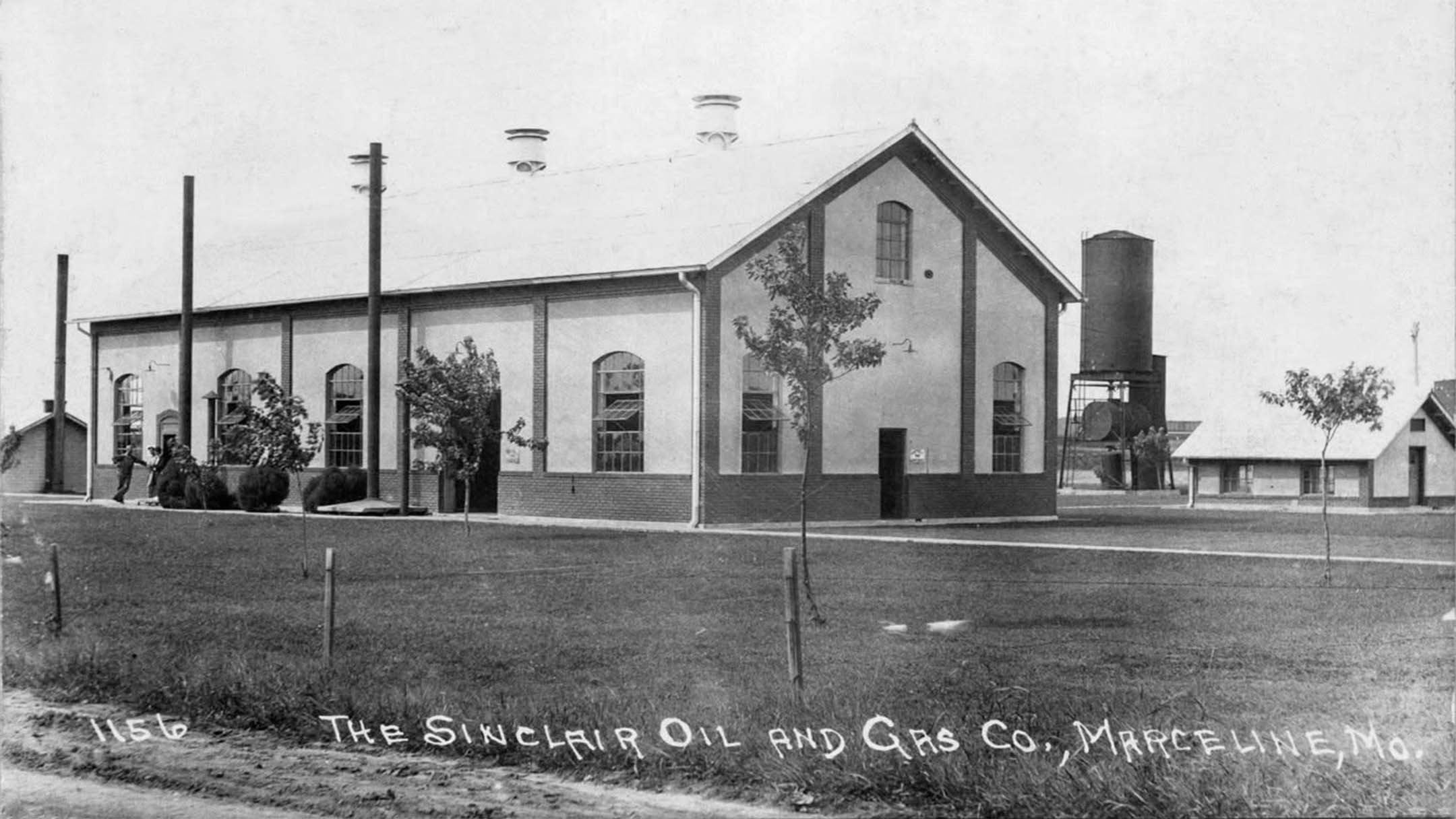 Black and white photo postcard of the Sinclair oil building. Text on the photo says "1156 - The Sinclair Oil and Gas Co., Marceline, Mo."