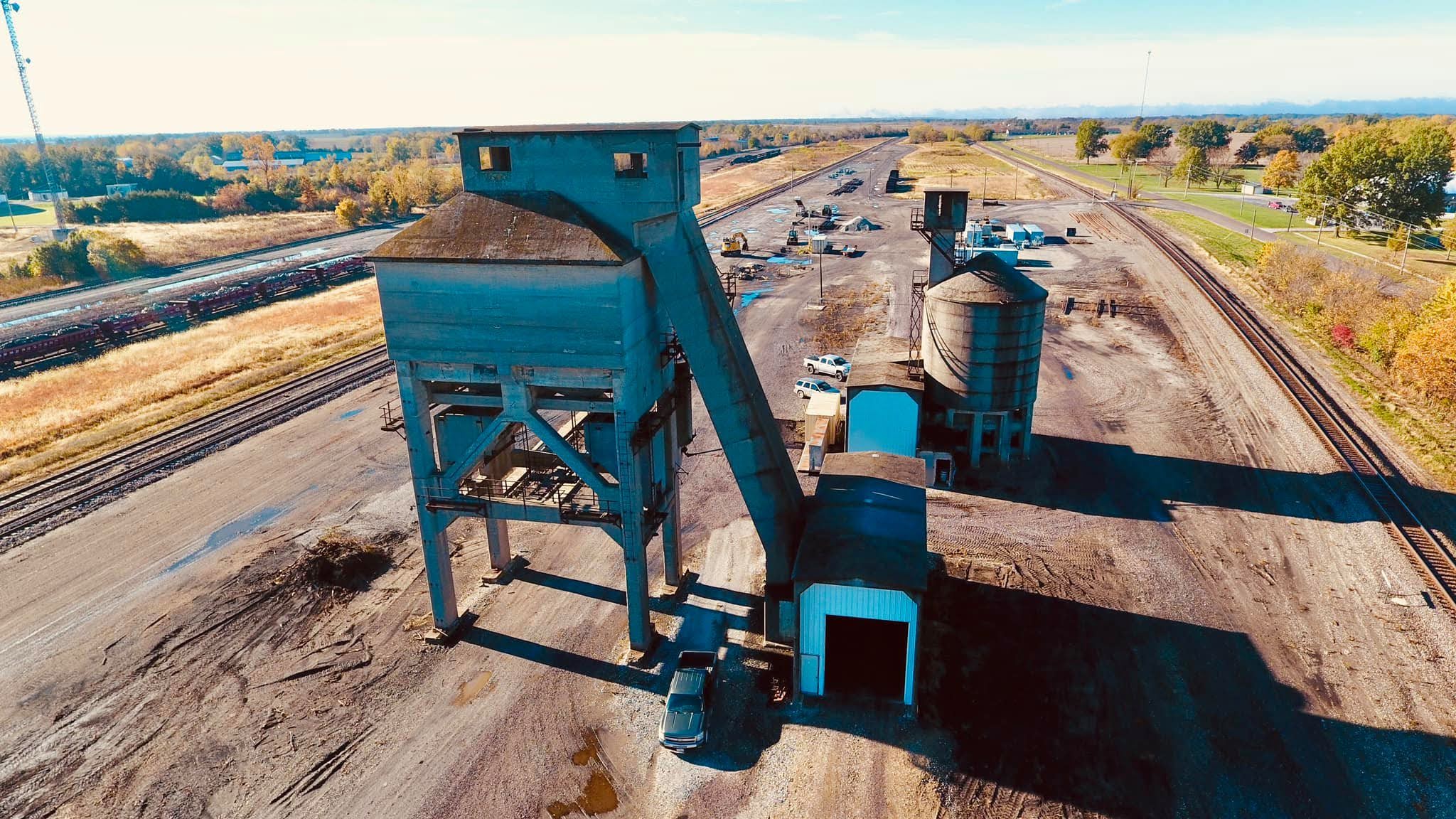 Aerial photo of the Santa Fe coaling and sanding towers in the BNSF railroad yard.