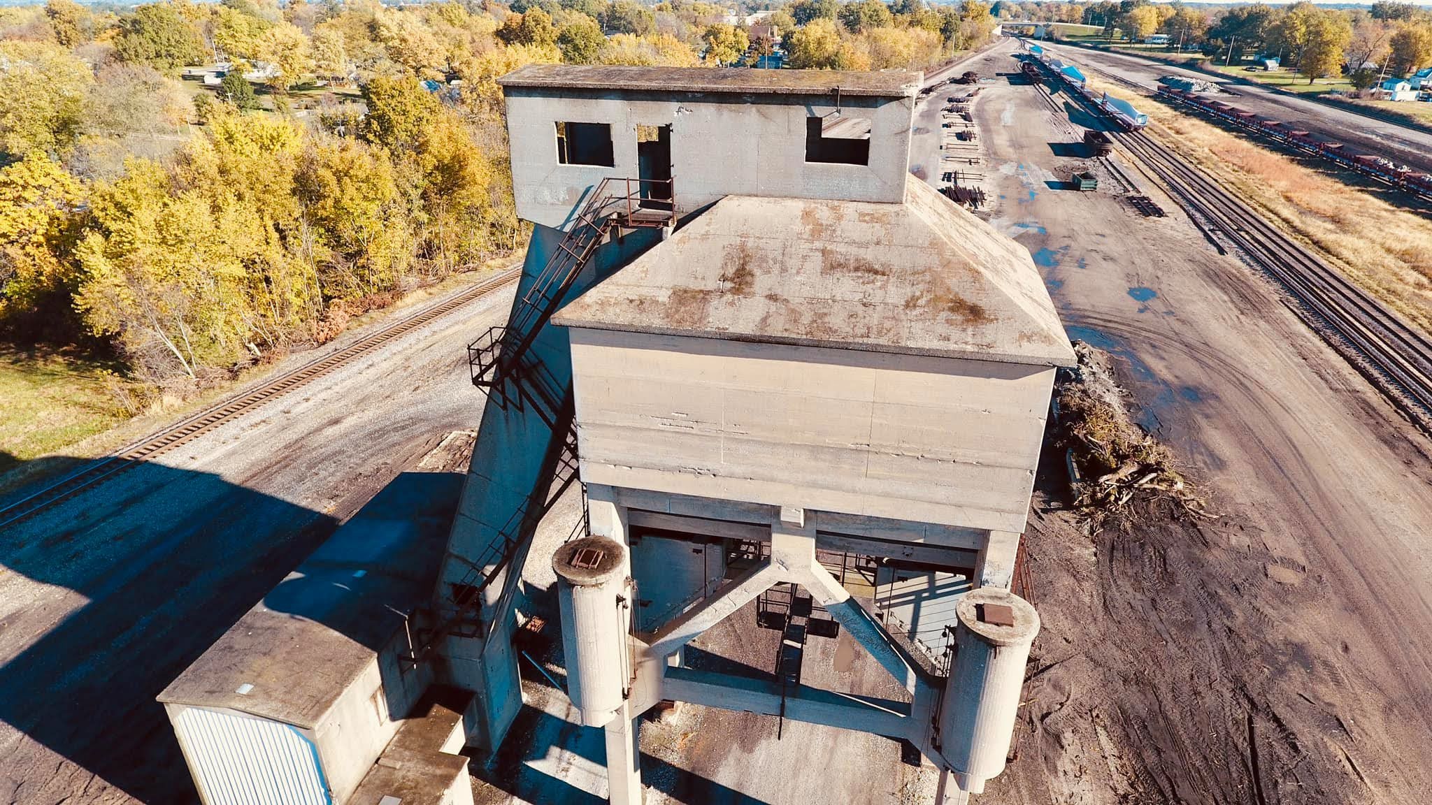 Aerial photo of the Santa Fe coaling tower in the BNSF railroad yard.