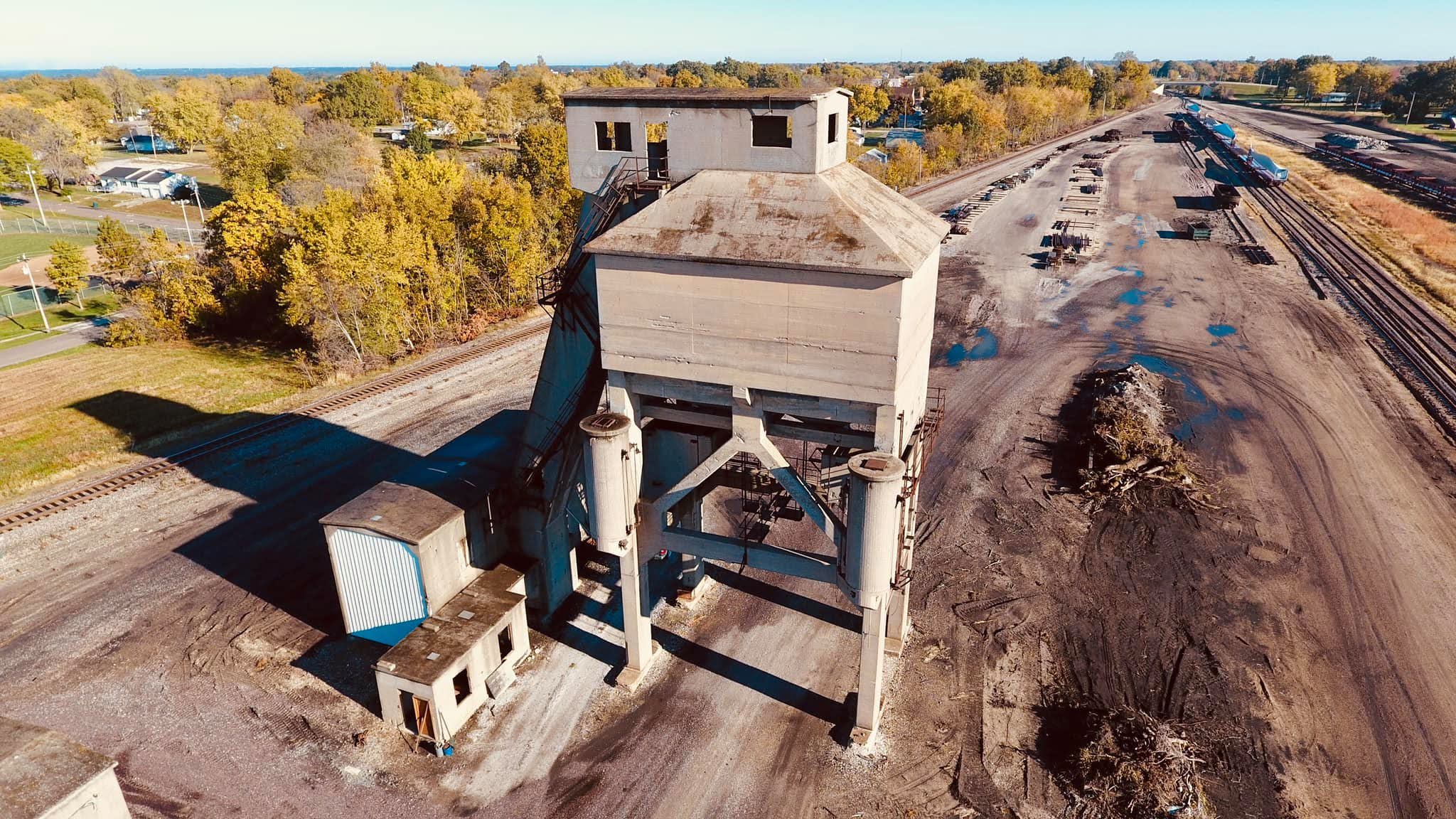 Aerial photo of the Santa Fe coaling tower in the BNSF railroad yard.